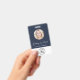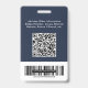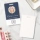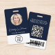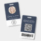 Crachá de identificação azul profissional moderno com a foto do seu funcionário em uma moldura circular, o nome dele em um script branco elegante e o cargo em letras brancas simples, e o logotipo da sua empresa. No verso, adicione informações adicionais e códigos QR e barras opcionais.
