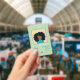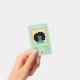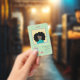 Um crachá de foto vertical e verde giro para o funcionarios escolar com a pequena ilustração aquosa de uma taça azul cheia de uma caneta, lápis e uma escova de arte ao lado de um casal de livros e uma maçã vermelha. Personalize-o com a fotografia, o nome, a nota ou o assunto ensinados pelo educador, o ano acadêmico, o nome e o endereço da escola. Há também um espaço para a assinatura do professor ou para um autocolante de código de barras. © ArianeC Ilustrações — Todos os direitos reservados