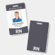 Um crachá para enfermeiros, incluindo fotografia, nome, número de identificação e código de certificação. Este crachá é ideal para funcionarios médicos como enfermeiro registrado RN, enfermeiro Prático Licenciado LPN, enfermeiro NP ou Unidade de Cuidados Intensivos ICU. Este moderno crachá de identidade dos empregados também funcionará bem para funcionarios em lares de idosos e de enfermagem. Note que o código de certificação, como RN, LPN, PN ou ICU, também é mostrado na parte de trás do crachá. Cor: Cinza Escura