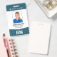 Um crachá para enfermeiros, incluindo fotografia, nome, número de identificação e código de certificação. Este crachá é ideal para funcionarios médicos como enfermeiro registrado RN, enfermeiro Prático Licenciado LPN, enfermeiro NP ou Unidade de Cuidados Intensivos ICU. Este moderno crachá de identidade dos empregados também funcionará bem para funcionarios em lares de idosos e de enfermagem. Note que o código de certificação, como RN, LPN, PN ou ICU, também é mostrado na parte de trás do crachá.