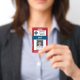 Foto de funcionário da empresa facilmente personalizável, crachá com código de bar e logotipo da empresa. O crachá está disponível com um clipe de metal, retrátil ou de ferro. Concebido por 1bizChoice (direitos reservados).