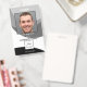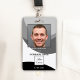 Crachá de identificação com foto com um design preto e branco com espaço para sua foto e logotipo personalizados. No verso, você pode adicionar um código de barras ou código QR personalizado e textos adicionais ou excluir os modelos. Você também pode copiar e colar o design e as fotos da frente para o verso, se desejar.