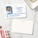 Crachá de identificação de funcionário com um design minimalista limpo em azul, preto e branco, onde uma moldura geométrica em azul céu e azul profundo envolve a foto do seu funcionário. Adicione seu logotipo ao lado do nome do local de trabalho e do nome do departamento em que o funcionário trabalha.