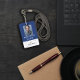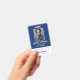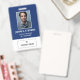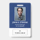 Crachá de identificação vertical de funcionário em azul e branco. Adicione foto, logotipo, nome, cargo, número de identificação.