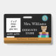 Um crachá de identificação horizontal fofo projetado para o ensino fundamental com uma lousa falsa, um ursinho e alguns livros. Além da personalização usual, como nome do professor, título, nome da escola e o ano de validade do crachá, este também permite adicionar o crachá do distrito escolar.