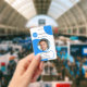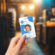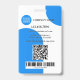 Crachá de identificação fotográfica com sua foto e logotipo personalizados em um design retro azul branco colorido. A área de texto inferior na frente mostra uma forma retangular, que você pode dimensionar no editor avançado. No verso, você pode adicionar um código de barras ou código QR personalizado e textos adicionais (ou excluir os modelos). Ótimo para criar uma presença que chama a atenção.