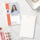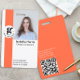 Destaque-se com este crachá de identificação personalizado laranja brilhante com sua foto, nome, cargo, logotipo da empresa e um código QR embutido. Inclui número de identificação do funcionário, datas de emissão e expiração e um endereço de devolução no verso. Ideal para funcionários, consultores e equipes corporativas.
