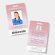 Este crachá de identificação personalizado em rose gold inclui uma foto do funcionário, nome, cargo, nome do hospital/empresa, localização, número de identificação do funcionário e código de barras. O fundo apresenta um degradê em rose gold. A parte de trás do crachá apresenta seu logotipo e campos de texto personalizados adicionais para informações de devolução ou outros detalhes. Perfeito para instalações médicas ou corporativas que precisam de identificação de segurança.