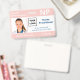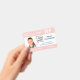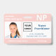 Mantenha seu hospital ou consultório médico seguro com crachás de identificação personalizados horizontais com a foto do funcionário, nome, abreviação do cargo profissional e título do cargo, número de identificação, logotipo e nome da empresa. Você também pode incluir um departamento, se desejar. Perfeito para enfermeiros e outros funcionários. No verso, você pode adicionar mais informações, como onde devolver o crachá se ele se perder. Personalize-o com uma foto, logotipo de qualquer forma e texto personalizado na barra lateral. A foto quadrada à esquerda tem uma borda branca fina cercada por listras rosa na parte superior e inferior e linhas rosa finas ao lado. Um bloco branco no centro do lado direito destaca o logotipo, título do cargo, número de identificação e data de validade em texto azul. O nome do funcionário, iniciais do cargo e texto do hospital ou empresa são brancos sobre rosa.