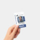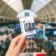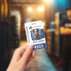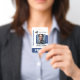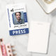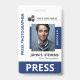 ID de imprensa vertical com azul como cor de destaque. Adicione foto, logotipo, nome, título, número de ID e mais.