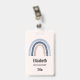 Crachá com um arco-íris fofo e caprichoso. Aquarelas azuis e pêssego.