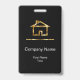 Crachás de funcionários de imóveis sofisticados ou representantes de campo com clipe incluído em um design elegante que inclui um símbolo de casa dourado e uma linha divisória geométrica com aparência metálica com modelos de nome e nome da empresa que você pode personalizar online. Projetado para um corretor de imóveis, corretor, agente ou agência. Perfeito para usar durante uma casa aberta para uma aparência profissional.
