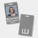 Crachá de ID do funcionário no design vertical clássico. Cinza de aço. Todos os elementos são modificáveis ou removíveis. Os elementos incluem: foto do funcionário, nome do funcionário, nome da empresa, departamento do funcionário. A parte traseira do design tem uma verificação de código de barras de segurança. Slot no topo para o pátio.