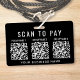 Sinal distintivo preto moderno para o seu negócio para coletar pagamentos em movimento com a opção de carregar 3 códigos QR para diferentes aplicativos de pagamento sem contato para os clientes lerem para efetuar pagamentos. Carregue os seus códigos QR e adicione o nome do seu negócio em letras brancas simples.