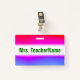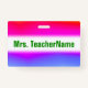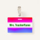 As características deste design do crachá um divertimento, arco-íris-como o teste padrão colorido do inclinação que caracteriza várias máscaras das cores gostam amarelo, alaranjado, vermelho, cor-de-rosa, roxo, azul e verde. Igualmente caracteriza um nome personalizado no texto colorido verde dentro de uma área colorida branco. Um crachá como este podia talvez ser vestido por um professor, por um professor, por um tutor ou por um professor durante as semanas adiantadas de um ano escolar ou de um curso. Pôde ajudar os estudantes a aprender e recordar o nome do seu professor. [~Z0000175]