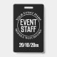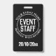 Um crachá para um Membro do Funcionarios de Eventos. Altere o texto para seus detalhes. Crachá de Funcionarios. Crachá de Funcionarios de evento para um pátio ou clipe. Crachá do Funcionarios de eventos oficial. Texto branco sobre fundo preto.