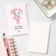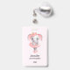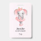 Um nome de etiqueta com uma ilustração adorável. Um elefante feminino cinza com um tutu cor-de-rosa e um balé dançante de flores, parado nos dedos das suas pernas.