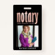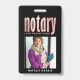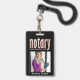 Crachá de negócios elegante e moderno para agente assinante de empréstimo notário com script de caligrafia manuscrito em falso foil rosa dourado ''notary'' em um fundo preto. Personalize com seus detalhes.