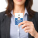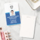crachá durável, de alta qualidade, de identificação personalizada de empresa e hospital. Na parte frontal, adicione facilmente o logotipo da sua empresa (ou exclua), a foto do funcionário, o nome, o título e as informações de ID. No verso, adicione linhas adicionais de texto personalizado, ou seja, endereço comercial, email, número de telefone, local de construção, etc. Adicione também um código de bar, código QR ou logotipo da empresa - ou exclua. O crachá atual oferece um esquema de cor azul que pode ser facilmente alterado para corresponder às cores da sua empresa.