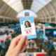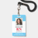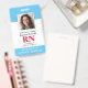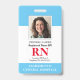 Crachá de Enfermeiro Registrado com ID de Fotografia Moderna RN. Design com antecedentes médicos azuis e brancos, fotografia do solteiro, nome do hospital, profissão e nome. Personalize com seu código de bar e detalhes de contato. Os crachás de ID modernos simplificam a identificação de funcionários por parte dos clientes e clientes. Para editar este modelo, clique em personalizar mais.