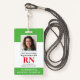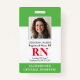 Crachá de Enfermeiro Registrado com ID de Fotografia Moderna RN. Design com antecedentes médicos verdes e brancos, fotografia do solteiro, nome do hospital, profissão e nome. Personalize com seu código de bar e detalhes de contato. Os crachás de ID modernos simplificam a identificação de funcionários por parte dos clientes e clientes. Para editar este modelo, clique em personalizar mais.