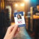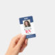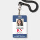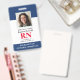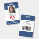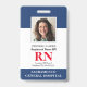 Crachá de Enfermeiro Registrado com ID de Fotografia Moderna RN. Design com marinho médico e fundo branco, fotografia do solteiro, nome do hospital, profissão e nome. Personalize com seu código de bar e detalhes de contato. Os crachás de ID modernos simplificam a identificação de funcionários por parte dos clientes e clientes. Para editar este modelo, clique em personalizar mais.