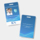 Crachá de Identificação Vertical de Enfermeiro Registrado (ou outro conforme pode alterar iniciais e descrição do cargo usando as caixas de texto fornecidas). Design com fundo azul e desenho de onda suave - tornando o design difícil de replicar por impostores - Adicione facilmente o logotipo da sua empresa usando nosso modelo de imagem. Iniciais RN na parte inferior em azul sobre faixa retangular branca NOTA: se estiver usando um SISTEMA DE PARCEIROS: retângulo branco e texto das iniciais podem ser alterados para qualquer outra cor necessária selecionando "personalizar ainda mais". Id com foto, nome, nome da empresa/hospital e número de identificação. Verso com área para informações caso o crachá seja perdido. Também disponível em apresentação horizontal. Para toda a equipe médica, OBRIGADO POR SEU SERVIÇO INCRÍVEL!