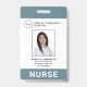 Crachá de foto médica em um layout vertical. Este design simples, mas profissional, apresenta uma borda de cinza azul no topo e na parte inferior com branco no meio. O modelo é personalizado com seu logotipo, nome do hospital, nome do funcionário, título, departamento/local e ID do funcionário. A borda inferior tem "ENFERMEIRO" em letras grandes em negrito e pode ser alterada para qualquer título desejado. A parte traseira tem as informações de contato e instruções para retornar, se encontradas. Este design clássico é perfeito para uma enfermeira registrada, enfermeira de emergência e muitos outros membros do funcionarios médico.