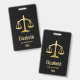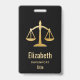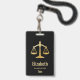 Crachá de nome personalizado com uma imagem de balanças douradas em um fundo preto. Simples e elegante.