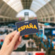 Retro 'España' lettering in red and yellow celebrates Spanish pride. Spain design evokes vintage travel and souvenir style. Bright España typography stands out for fans of Spain.
