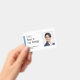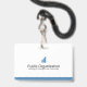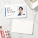 Um crachá moderno de identificação para voluntários usando a frase "Estou aqui para ajudar" como texto de introdução. O design de crachá inclui a foto de identificação dos voluntários e o nome dos voluntários. O verso mostra o nome do evento ou organização. Este crachá também funcionaria como excelente para o funcionarios de vendas.