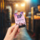 O VIP perfeito para o crachá de eventos de passe de acesso para o seu próximo concerto ou evento ao vivo. Substitua pelo nome, localização e data do seu concerto. Use esta foto ou substitua-a por sua própria, tanto na frente como na parte traseira do crachá. Fácil de personalizar. Pegue o seu hoje!