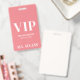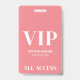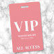 Crachá de evento VIP simples e feminino com acesso total. Ótimo para desfiles de moda, shows, grandes eventos especiais como conferências, palestrantes e pode até funcionar para uma festa de aniversário ou qualquer outra festa onde você queira fazer seus convidados se sentirem especiais. Um visual simples moderno, porém elegante. Na parte inferior, há uma fonte serifada em negrito misturada com tipografia simples, com VIP, o nome do evento, data e 'Acesso Total'. Você pode alterar todas as informações de texto e cores deste crachá a partir da atual coloração rosa e branca.