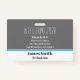Crachá de Evento Horizontal Personalizado em cinzas escuras, branco e cores azuis do estropo policial. Todos os elementos são passíveis de adaptação às suas necessidades. Elementos: nome do evento, data do evento, local do evento, nome do participante do evento, título do participante do evento. Slot no topo para um pátio. Também disponível na orientação vertical nesta loja.