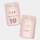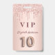Um crachá moderno, elegante e glamoroso para a festa de 10 anos de uma menina. Um fundo metálico rosa dourado falso com um efeito de brilho rosa dourado elegante e um visual de gotejamento de tinta. O nome é escrito com um estilo de letra manuscrita moderna em cor rosa dourado escuro. Com o texto: VIP O número 10 é escrito com uma fonte estilo balão.