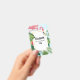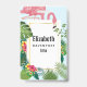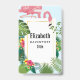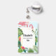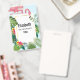 Crachá personalizado com um flamingo cor-de-rosa giro e caprichoso. Cercados por folhas tropicais verdes e flores de hibisco vermelhas e amarelas. Um quadro de gradiente dourado em forma de retângulo no centro.