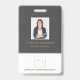 Crachá de nome de funcionário de imobiliária moderna com foto e logotipo. Projetado com cores tons de cinza escuro e dourado com um espaço para sua foto, logotipo, nome, cargo e nome da empresa. Perfeito para um Corretor, Agente, Corretor ou qualquer profissional do mercado imobiliário. Use durante casas abertas, eventos de apreciação de clientes e visitas domiciliares.