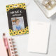 Crachá de identificação vertical de girassol personalizado com foto, nome e título com girassóis contra crachá de identificação de grãos de madeira impressa no jardim de infância com tema de girassol. O terapeuta de arte crachá com um olhar de girassol rústico com sua foto contra grãos de madeira escura e girassóis amarelos brilhantes.