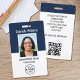 Crie uma aparência profissional com um crachá de identificação de funcionário personalizado. Faça o upload do logotipo da sua empresa e foto de perfil, e personalize o texto com nome, cargo e nome da empresa. As informações de devolução estão no verso, junto com informações adicionais e um código QR. Perfeito para criar uma experiência de marca coesa ou simplesmente para verificar a identidade do portador e exibir suas qualificações. Este crachá de identificação é ideal para funções que lidam diretamente com clientes e ambientes corporativos; desde consultores de negócios e lojas de varejo até profissionais médicos, funcionários de hospitais, trabalhadores de escritório, equipes de conferências, eventos corporativos e muito mais. Crachás personalizados constroem a identidade da marca e aumentam a segurança. Modelo totalmente editável. Cores de impressão: azul-marinho muito escuro, cinza e branco. Formato vertical. Explore a coleção online para encontrar designs impressos correspondentes!