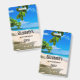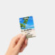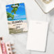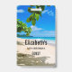 Placa de identificação de convidado com uma fotografia adorável. Uma praia de areia branca com água azul-azulada. Imagem relaxante com um céu ensolarado e ondas suaves e espumosas com algumas folhas tropicais fofas emoldurando a imagem.