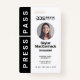 Crachá de identificação de fotos com o passe preto e moderno. O design apresenta "Press Pass", exibido ao longo do lado, para uma fácil visualização e identificação. A foto é exibida em círculo para criar um olhar moderno. Personalizar com logotipo, foto, título do trabalho, data de adesão/validade e número de ID. O verso apresenta design preto e branco com um logotipo e endereço. A cor pode ser alterada para qualquer cor que se ajuste à sua marca, basta clicar em personalizar e clicar para personalizar ainda mais.