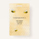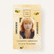 Um crachá para funcionários de centros de jardim, viveiros de plantas, viveiros. Personalize e adicione sua foto, título, logotipo da empresa, nome da loja. Um padrão amarelo de favos de mel decorado com abelhas felizes e sorridentes. Voltar: seu texto.