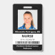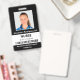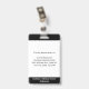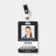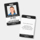 Mantenha seu hospital ou consultório médico seguro com crachás personalizados de identificação com a foto do funcionário, nome, cargo, número de identificação e código de barras, bem como o nome da empresa. Você também pode incluir um departamento, se desejar. Perfeito para enfermeiros ou outros funcionários. No verso, você pode adicionar mais informações, como onde devolver o crachá se ele se perder. Personalize-o com uma foto, código de barras e texto personalizado na barra lateral. A foto quadrada tem uma borda branca fina em um fundo preto. Uma faixa branca perto da parte inferior destaca o código de barras, cargo e número de identificação em texto preto. O nome do funcionário e o texto do hospital ou empresa são brancos sobre preto.