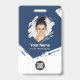 Personalize facilmente este crachá de nome de funcionário personalizado com pincelada com foto, código de barras e logotipo da empresa. Um design de negócios criativo em cores azul-marinho e branco com foto do funcionário em forma de pincelada, totalmente personalizável, tamanhos frente e verso, fontes básicas e modernas sem serifa e uma aparência criativa, atraente e clara. Disponível com cordão, clipe de metal ou retrátil. Sem pedido mínimo.