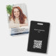 Um design simples apresenta um crachá de foto de funcionário com nome e título, perfeito para empresas corporativas, segurança personalizada, perfeito para funcionários de negócios, com um código QR de barra, suprimentos de escritório padrão, com um fundo preto e branco minimalista simples, básico limpo, evento de feira comercial.