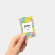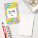 Nome de etiqueta com uma foto deliciosa. Uma foto macro de um pirulito. Cor azul rosa e amarelo pastel em um padrão espiral.