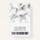 Crachá personalizável com visão de fundo de mármore branco e borda preta na parte inferior. Carregue seu próprio logotipo, foto e código de barras e faça marcas de nome personalizado e crachás de ID de funcionário para sua empresa. Modelo fácil de usar. Você pode redimensionar a foto, o logotipo e o código do bar com a ferramenta design. Para redimensionar a foto você precisa primeiro desmascará-la. Fontes e cores, exceto a parte branca do gradiente, são totalmente personalizáveis.