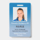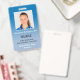 Mantenha seu hospital ou consultório médico seguro com crachás personalizados de identificação com a foto do funcionário, nome, cargo, número de identificação e o nome da empresa, bem como o departamento, se desejar. Perfeito para enfermeiros ou outros funcionários. No verso, você pode adicionar mais informações, como para onde devolver o crachá se ele se perder. Personalize-o com uma foto e texto personalizado na barra lateral. A foto quadrada tem uma borda branca fina em um fundo gradiente de azul para azul claro. O cargo, número de identificação e data de validade estão em texto sem serifa em azul-marinho. O nome do funcionário e o texto do hospital ou empresa estão em uma fonte serifada branca para contraste.