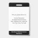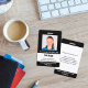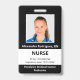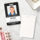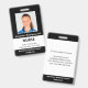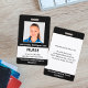 Mantenha seu hospital ou consultório médico seguro com crachás de identificação personalizados com a foto do funcionário, nome, cargo e número de identificação, bem como o nome da empresa. Você também pode incluir um departamento, se desejar. Perfeito para enfermeiros ou outros funcionários. No verso, você pode adicionar mais informações, como para onde devolver o crachá se ele se perder. Personalize-o com uma foto e texto personalizado na barra lateral. A foto quadrada tem uma borda branca fina em um fundo preto. Uma faixa branca perto da parte inferior destaca o cargo, número de identificação e data de validade em texto preto. O nome do funcionário e o texto do hospital ou empresa são brancos sobre preto.