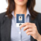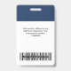 Personalize facilmente este Crachá de Nome de Funcionário Personalizado com Foto, Código de Bar de Digitalização e logotipo comercial. Um simples design de negócios em cores azul e branco marinho totalmente personalizável em tamanhos frontais e traseiros, fontes básicas e modernas sans-serif e um visual profissional e claro. Disponível com jardim, clipe de metal ou com retratável. Sem ordem mínima.